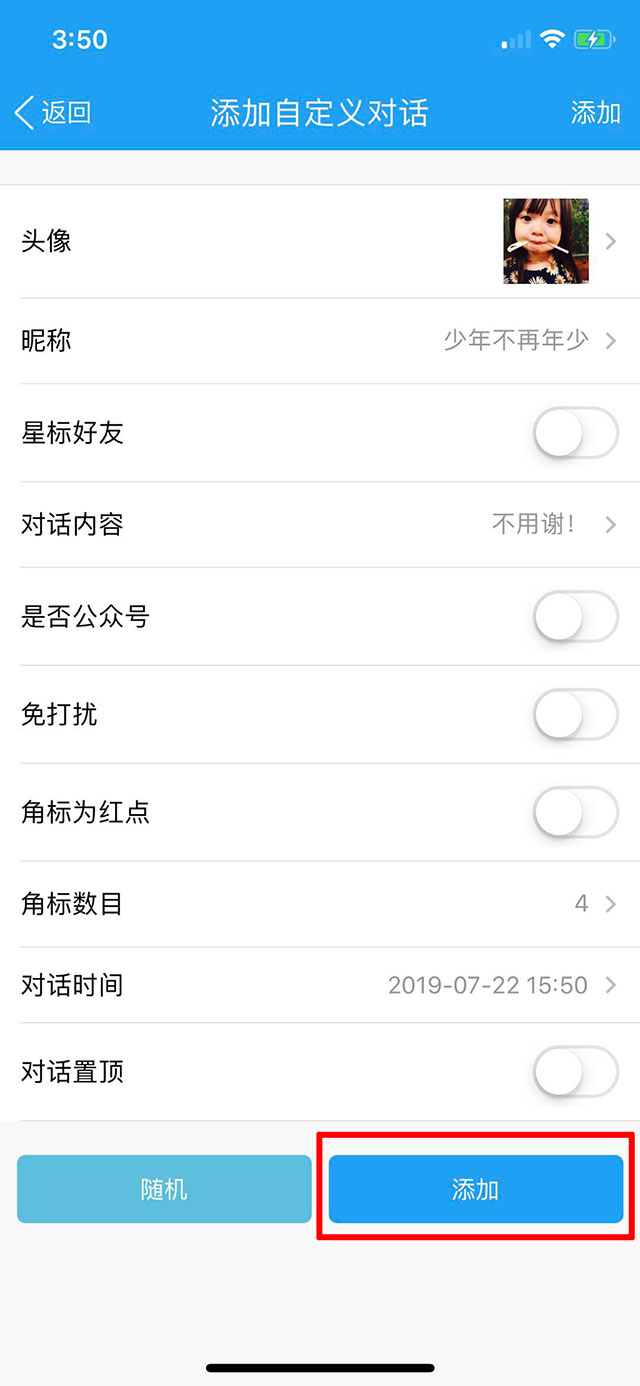 4.填写用户的信息、对话内容、对话时间等。单聊请勿打开“是否公众号”按钮,然后选择添加