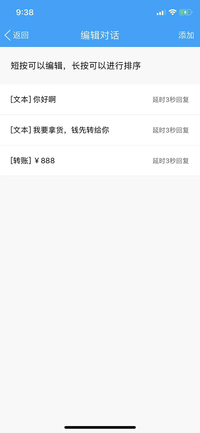 7.切换到自己发消息后,我们随便输入一些文字,例如“你好”,等待3秒后(预设延时3秒回复),对方就会自动回复“你好啊”,接着我们在回复信息,对方也会自动按照我们预设好的回复内容进行回复