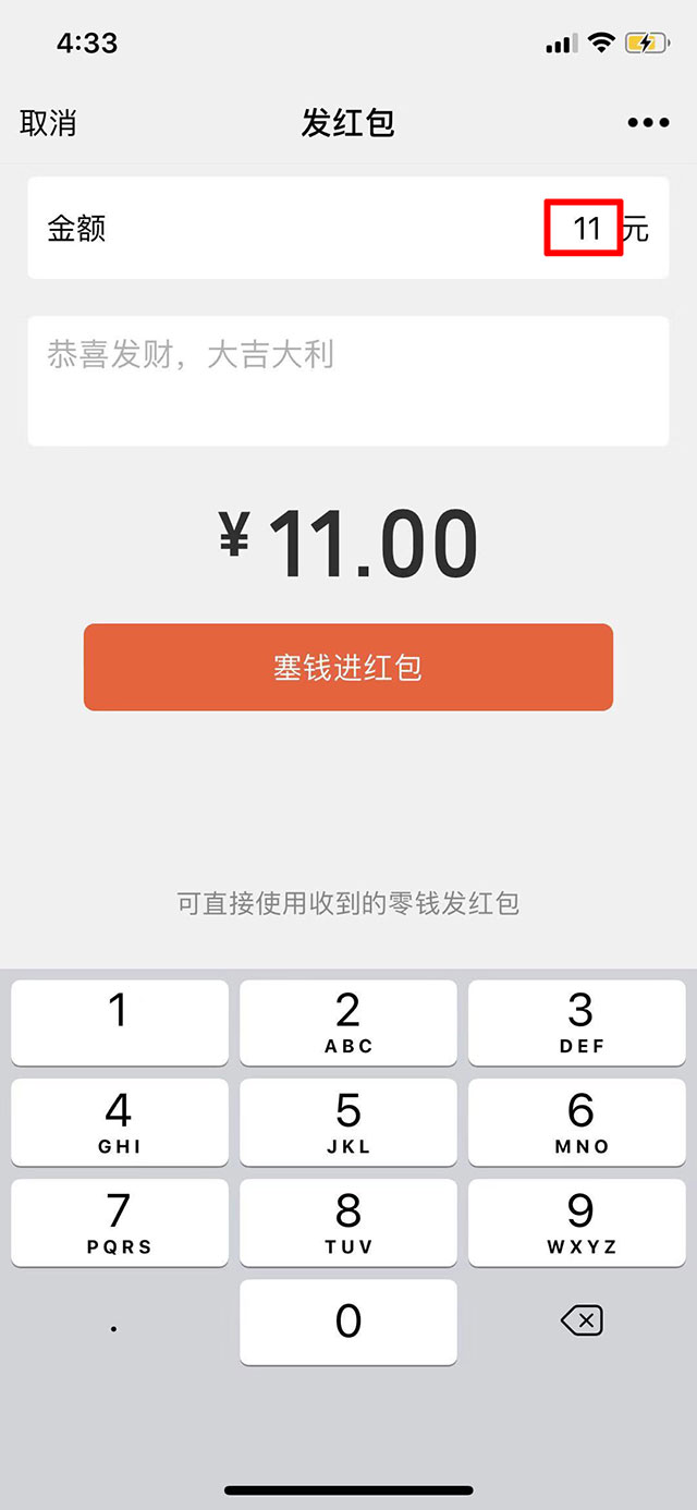 2.点击输入要发的红包金额,然后点击红色的塞钱进红包按钮